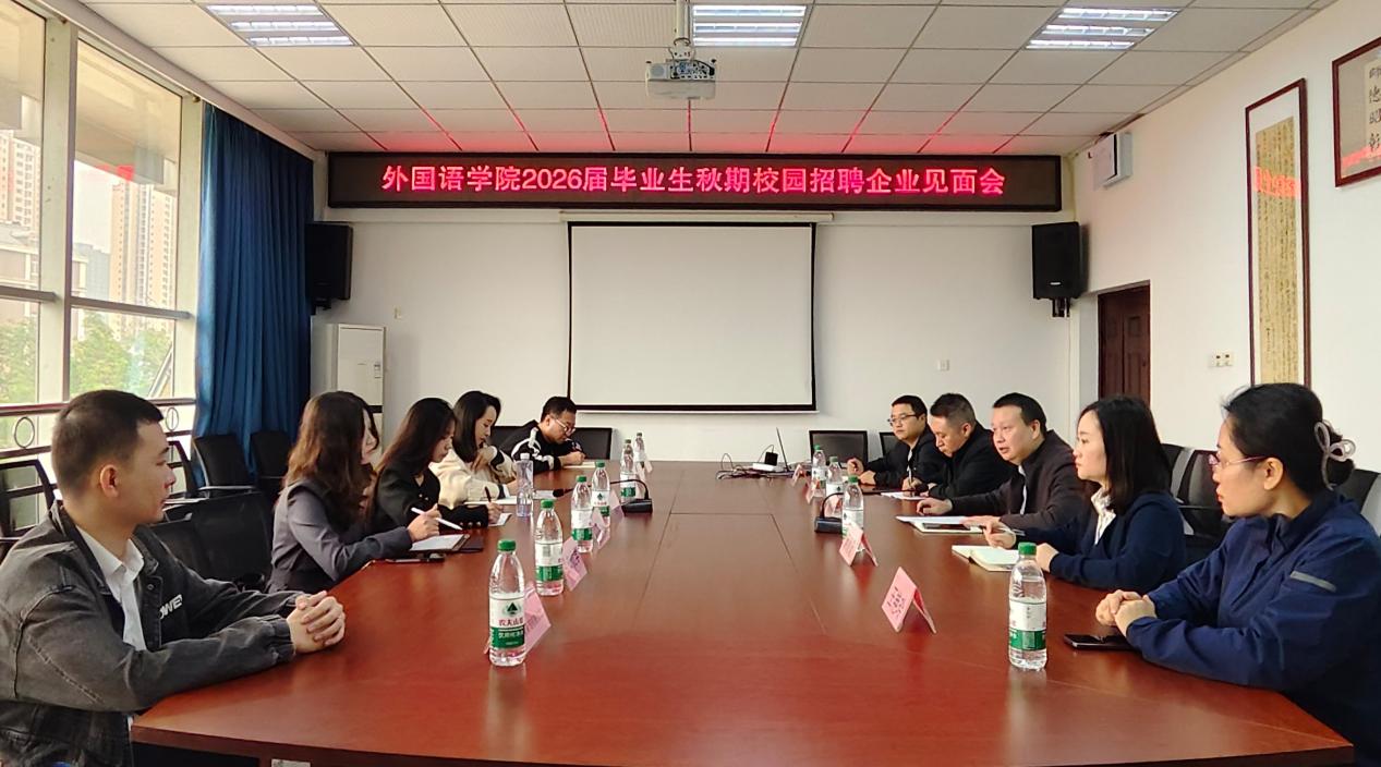 为进一步深化校企合作,精准对接企业用人需求,招聘会期间,外国语学院与参会企业举行专题座谈会。学院党委书记陈柏材介绍了近年来学科建设、人才培养模式改革及毕业生就业质量等情况,各企业代表结合行业发展趋势,围绕外语类人才的核心能力要求、岗位技能标准等内容建言献策,并表达了与学院开展实习基地建设、定制化人才培养等合作的强烈意愿。双方就后续校企合作模式、实习就业联动机制等达成多项共识,为实现校企资源共享、协同育人奠定了坚实基础。