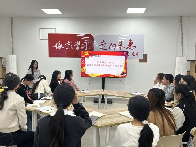 会上,邓巧同志领学了《习近平谈治国理政》第五卷学习内容,并根据习近平总书记对党校(行政学院)工作的重要指示精神对党支部的日常学习做部署与安排,强调要坚持不懈用习近平新时代中国特色社会主义思想凝心铸魂。在学习习近平总书记给天津大学全体师生的回信内容时,各党员聚焦如何提高自身专业能力,更好服务经济社会发展,为建设教育强国科技强国、推进中国式现代化作出新的贡献等方面展开小组讨论。紧接着,全体成员在刘中坪、黄严黎、汪家莉小组带领下深入学习了习近平总书记在庆祝中华人民共和国成立76周年招待会上的讲话精神和《中华民族共同体的形成和发展是人心所向、大势所趋、历史必然》重要文章。