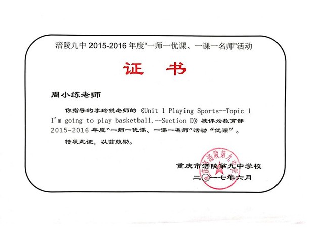 多轮教育改革带给我们不同的视角来看待教学行为、课程和学生。她在学习中进步,在探索中续航,在实践中校正。她参与多项市级课题的研究并承担区级课题的负责人,在各级刊物上发表过多篇文章,担任校本教材和重庆市中考学习指要综合本的副主编等。
