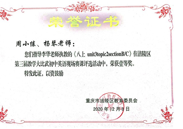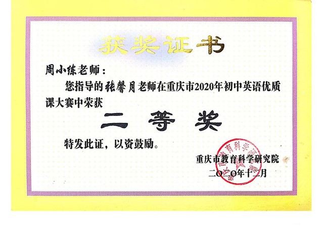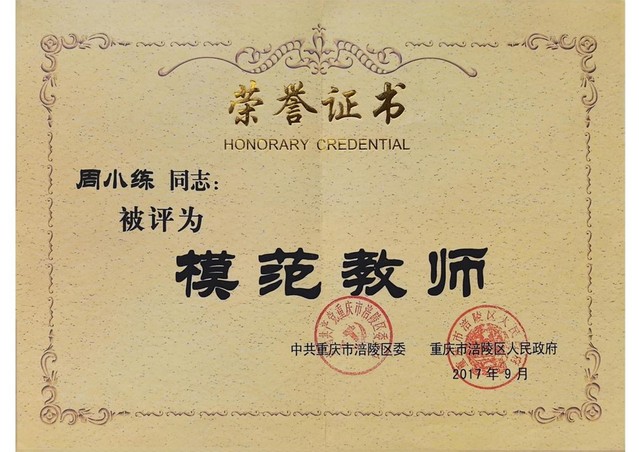 周小练更关注青年教师的发展与成长。她连续5年被评为“优秀实习指导老师”,数次承担涪陵区组织的讲座并担任教学大比武评委,在指导青年教师参赛中多次获得指导一等奖。