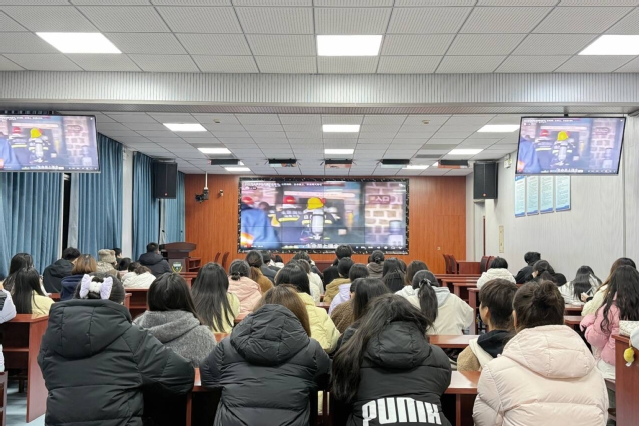 活动现场,一系列涵盖“家庭与校园火灾隐患排查”“初期火情处置方法”“高层建筑逃生技巧”等主题的消防短片依次播放。短片内容兼具警示性与实用性,既包含真实火灾案例的警示片段,又呈现了消防员现场演示灭火器操作、防烟面罩佩戴等实操教学画面。观影过程中,学生们专注记录关键知识点。当播放到“宿舍用电安全注意事项”的相关片段时,引发了学生们的讨论。此次短片采用“案例警示+场景教学”的形式,将抽象的消防知识转化为具体的场景应对方法,帮助学生在沉浸式观看中构建起“隐患识别—初期处置—安全逃生”的完整认知链。