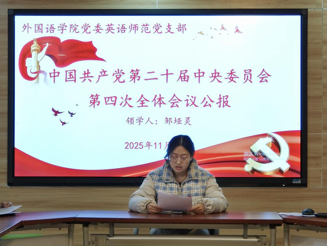 活动聚焦全会精神核心要义,设置专题领学环节,七位党员同志围绕党的二十届四中全会相关重要文献进行系统解读。邹垭灵首先领学《中国共产党第二十届中央委员会第四次全体会议公报》,从时代背景、核心要义和目标任务三个维度,系统阐释全会的重大战略部署。冉晓宇结合“十五五”规划建议,重点解读了高等教育与人才培养相关内容,引导大家思考英语师范专业建设与国家战略的对接点。韩宇围绕习近平总书记关于规划建议的说明,深入阐释政策制定的深层逻辑与民生导向。