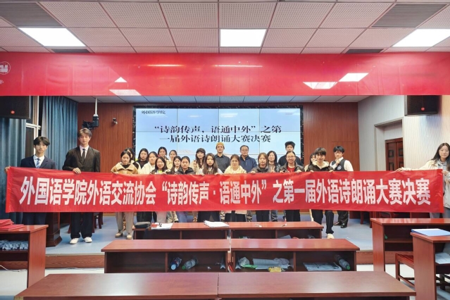 11月26日晚,外语交流协会于钩深楼501举办了“诗韵传声·语通中外”之第一届外语诗朗诵大赛决赛。本次决赛由日语系刘九令教授、英语外教Dustin Johnson和教师项谊担任评委,我院全体学生积极参与。
