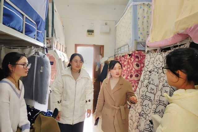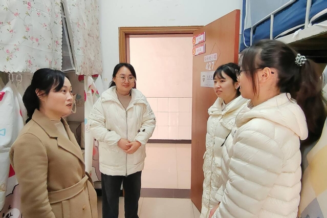 12月11日中午,副院长蒋朝霞与2025级辅导员陶歆妍前往南九学生宿舍楼,开展了12月学生寝室查寝工作。
