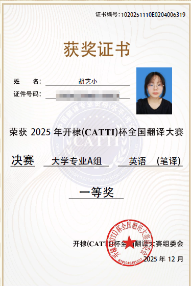 12月15日,2025年开棣(CATTI)杯全国翻译大赛结果正式公布。我院2023级英语非师范专业的陈赠谕、胡艺小两名同学在大学专业A组笔译赛道中表现突出,双双荣获全国一等奖。这是我院学生连续第三年该赛事中荣获全国级别重要奖项,充分彰显了学院翻译人才培养的持续成效