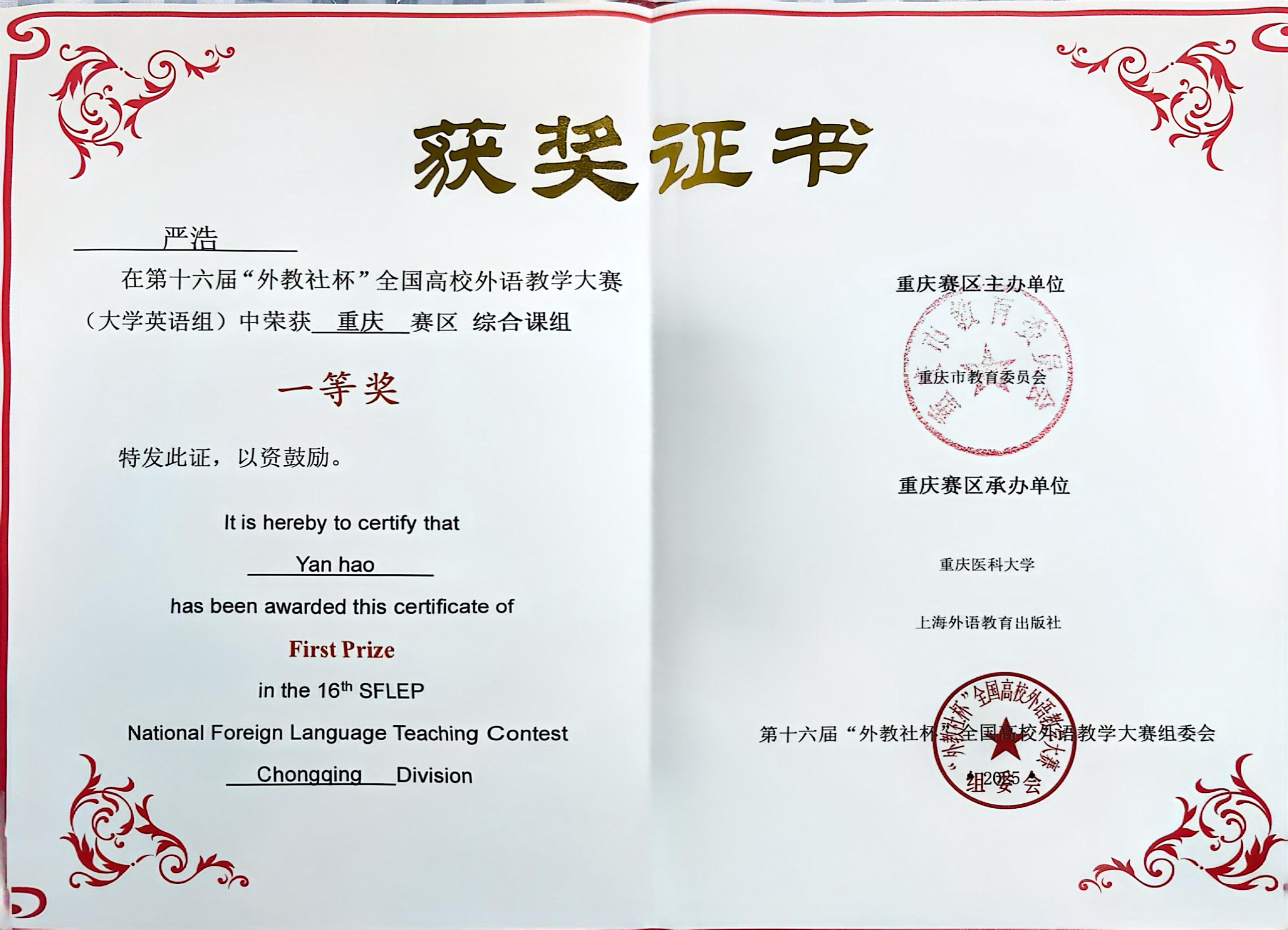 2025年9月20日至21日,第十六届“外教社杯”全国高校外语教学大赛(大学英语组)比赛在重庆医科大学圆满落幕。经过两天的激烈角逐,我院严浩老师与张婕老师凭借出色的教学表现和扎实的专业素养,分获综合组一等奖和视听组二等奖。其中,严浩老师更以复赛综合组第一名强势晋级决赛,并在决赛中表现卓越,最终荣获市级一等奖(排名第一),展示出我院外语教师深厚的教学功底与优秀的竞赛水平。