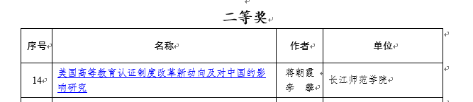 近日,重庆市教育委员会、重庆市人民政府教育督导室正式公布了第七届教育督导典型案例及研究论文评选结果。我院教师蒋朝霞撰写的学术论文《美国高等教育认证制度改革新动向及对中国的影响研究》在全市众多参评成果中脱颖而出,荣获研究论文类二等奖。