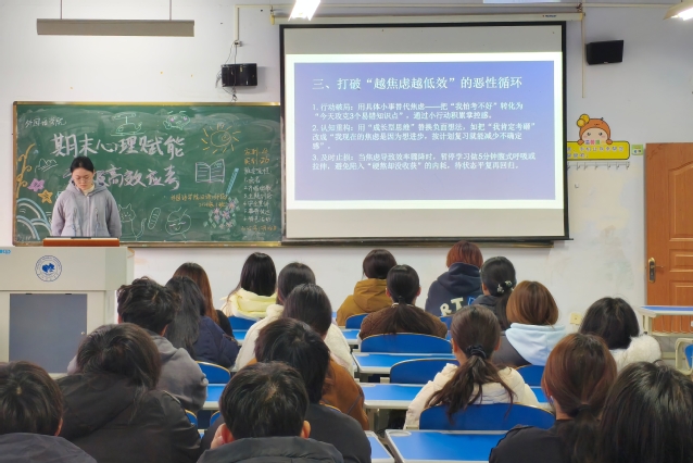 为帮助学生科学调适期末备考心理压力,掌握高效复习方法,以积极诚信的姿态迎接期末考试,12月28日,我院于诚意楼五楼开展了“期末心理赋能,积极高效应考”主题班会,全体学生积极参与。