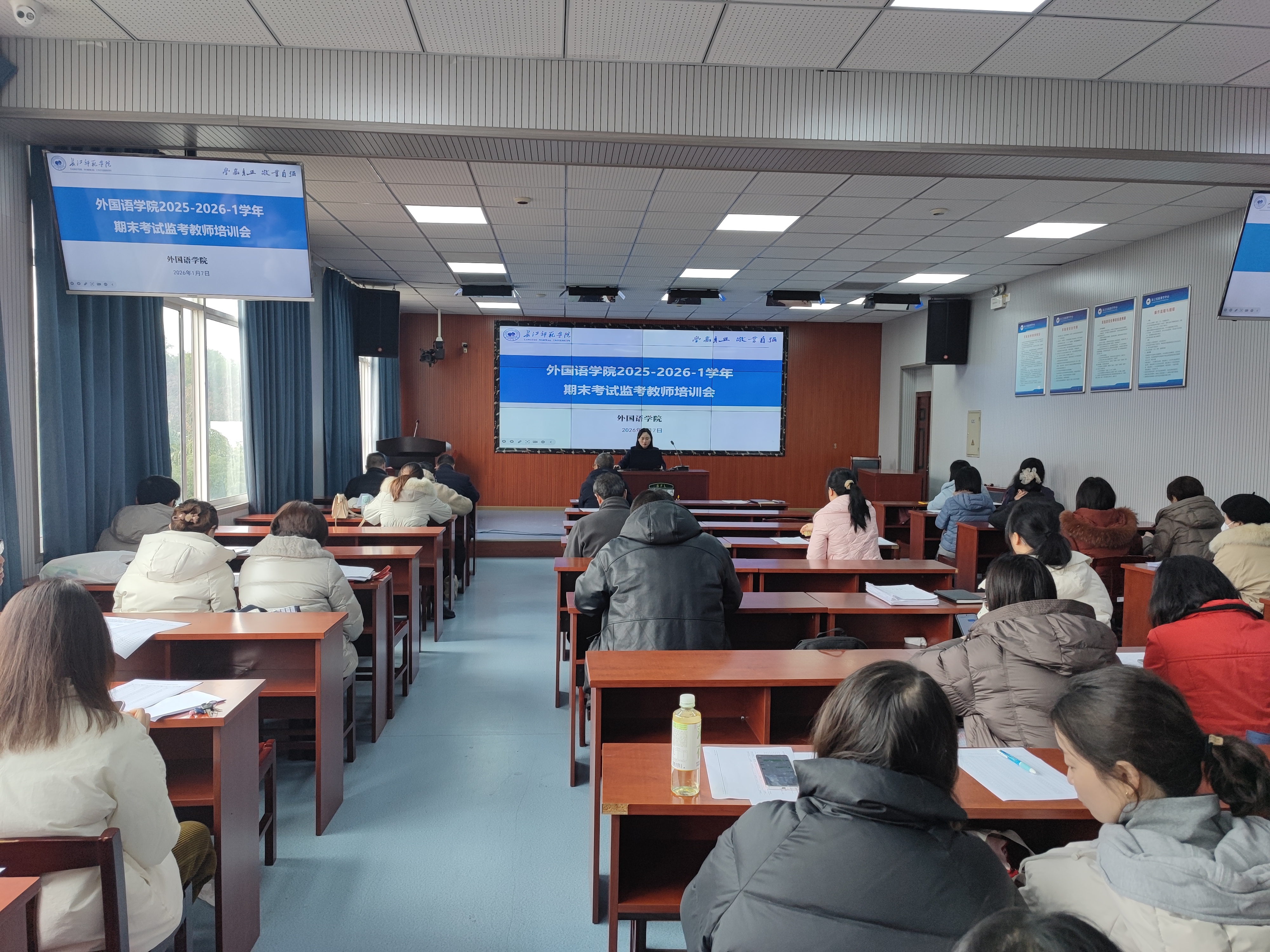 为严肃考试纪律,营造公平公正、诚信有序的考试环境,确保2025-2026学年第一学期期末考试工作顺利进行,外国语学院近期分别组织召开监考教师培训会与学生考风建设动员会,从教师和学生两端同步发力,夯实考试工作基础。