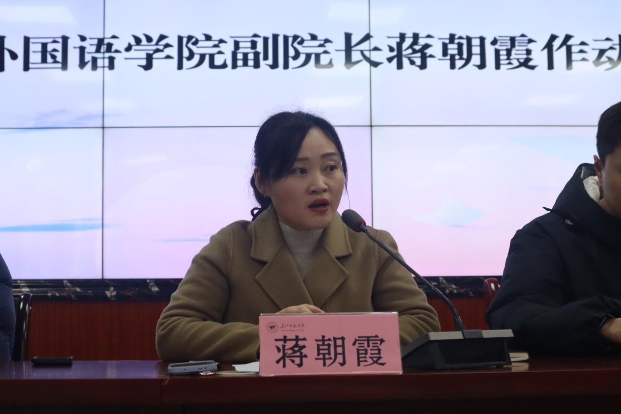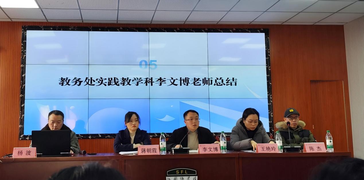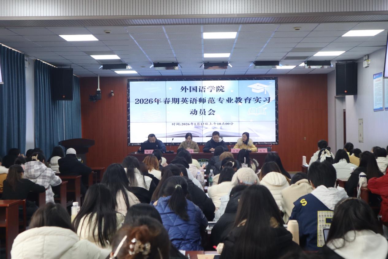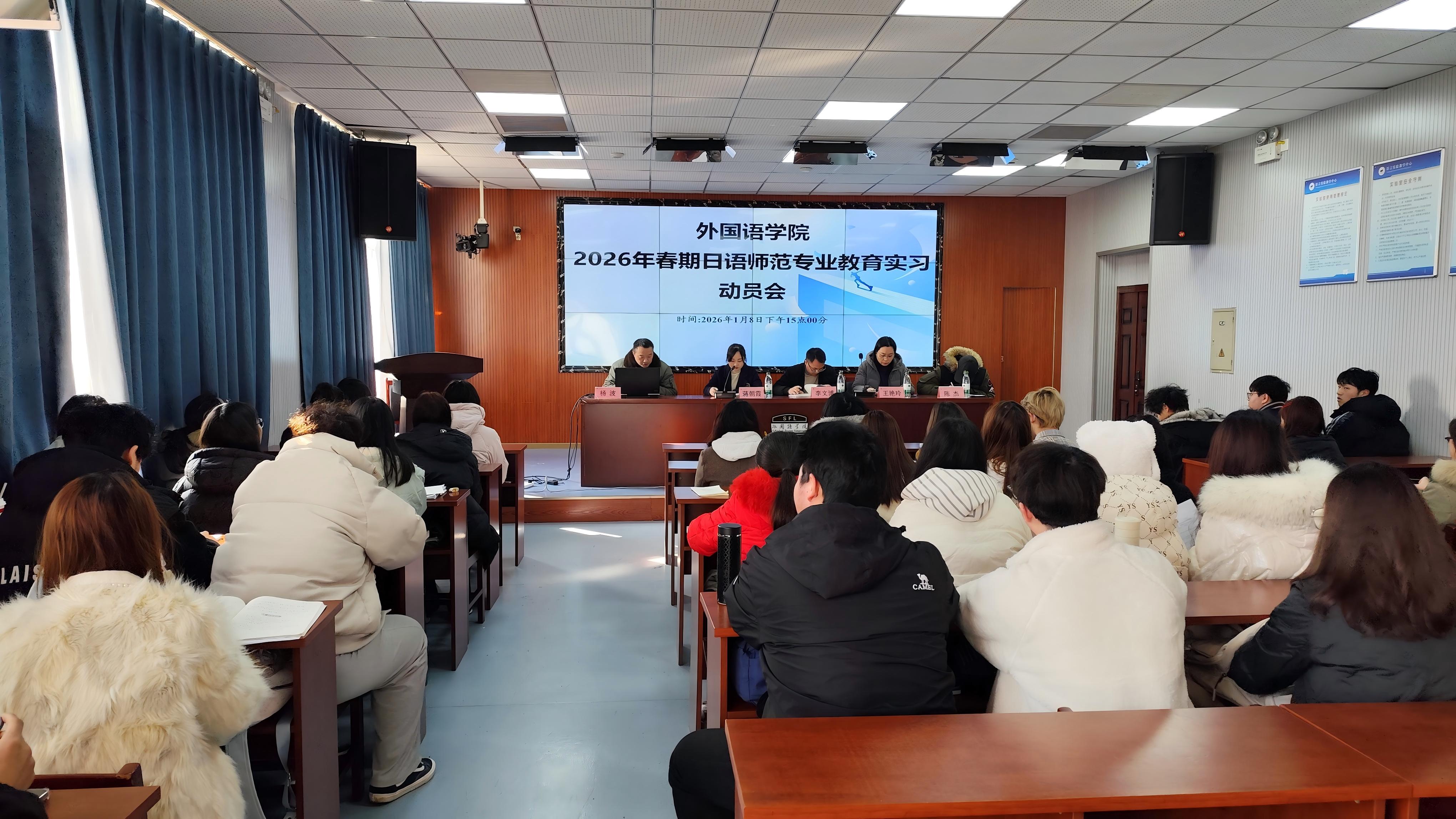 为切实做好2023级师范生教育实习工作,明确实习要求、强化责任意识、提升实习质量,近期,外国语学院分别于2026年1月8日下午和2026年1月12日上午为日语师范、英语师范专业召开2026年春期教育实习动员大会。会议均在钩深楼501教室举行,由学院实践教学中心主任杨波主持,学校教务处实践教学科科长李文博、学院分管教学副院长蒋朝霞、相关系主任、实习带队老师、年级辅导员及2023级对应专业全体学生参会。
