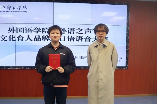 经初赛选拔,共有8名选手成功晋级决赛。决赛现场,选手们依次登台,以标准的语音语调、自然的表达方式和富有感染力的表现,充分展现了扎实的语言功底与良好的专业素养。最终,2025级日语师范2班张智翔凭借出色的语音面貌与沉稳的舞台表现荣获大赛特等奖。