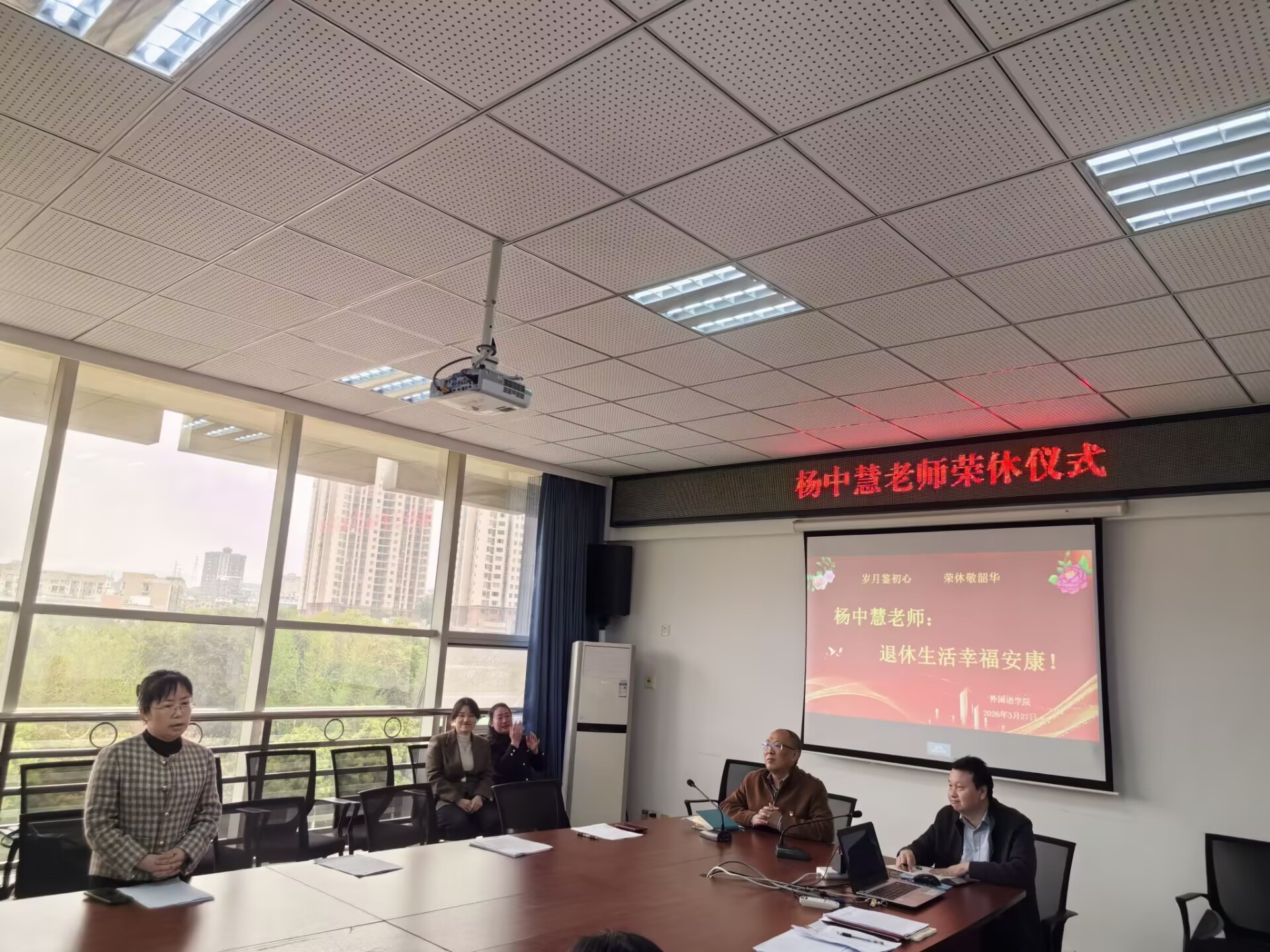 为弘扬优秀师德师风,传承尊师重教的优良传统,有效加强学院师资队伍和文化建设,3月27日中午,外国语学院在钩深楼508会议室举行杨中慧老师光荣退休仪式。仪式由党委书记、工会主席陈柏材主持。